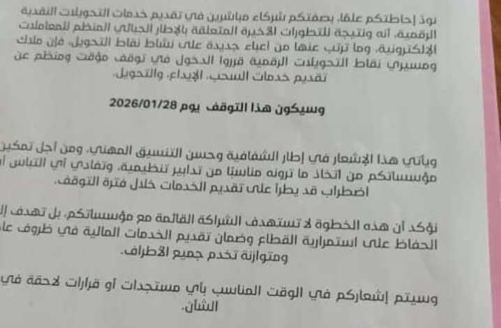 أعلن تجمّع نقاط التحويل الرقمي عن إغلاق جميع وكالات التحويل التابعة للوكلاء والمستثمرين، وذلك احتجاجًا على فرض ضرائب جديدة شملت…