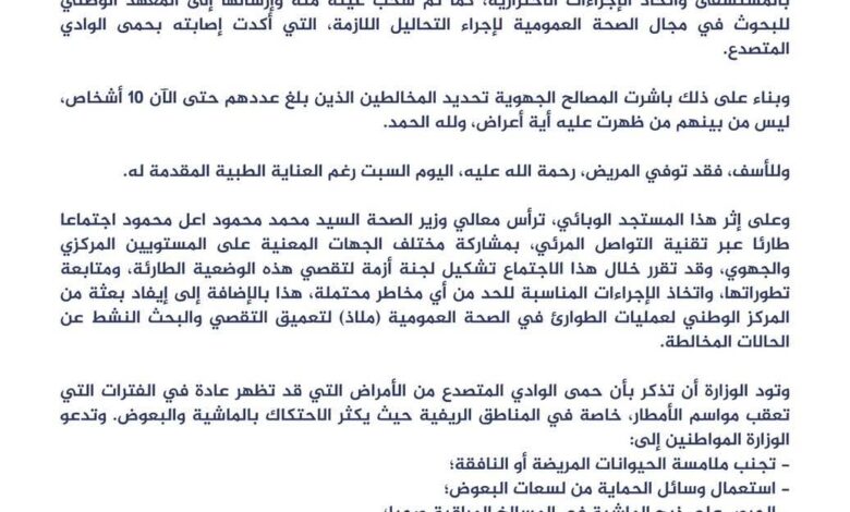 أعلنت وزارة الصحة، اليوم السبت، تسجيل حالة وفاة مؤكدة بسبب حمى الوادي المتصدع بمركز الاستطباب الجهوي في مدينة روصو. ويتعلق…