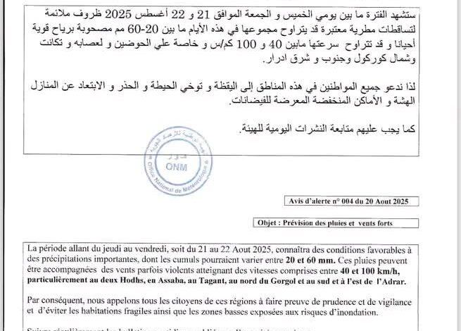 أكمل القراءة »تتوقع الهيئة الوطنية للأرصاد الجوية هطول أمطار معتبرة مصحوبة برياح قوية، يومي الخميس والجمعة، بعدد من الولايات الداخلية من بينها…