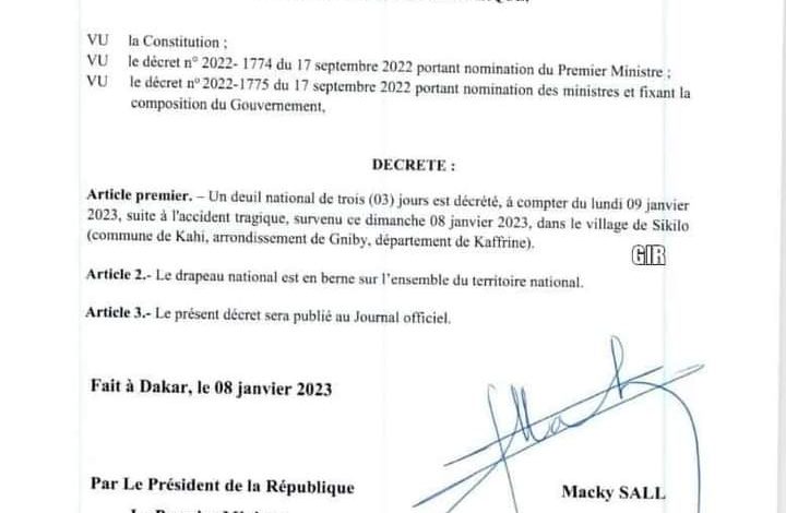 أكمل القراءة »أعلن الرئاسة السنغالية في مرسوم صادر عنها اليوم الأحد، 08 يناير، عن حداد وطني لمدة ثلاثة ايام، إثر مقت 40…