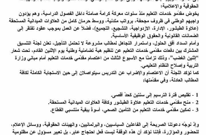أعلنت لجنة التنسيق المشترك بين دفعات مقدمي خدمات التعليم عزمها تنظيم وقفة احتجاجية جديدة يوم الاثنين، تحت شعار “اثنين الغضب”، في إطار خطوات تصعيدية متواصلة للمطالبة بتحسين أوضاعهم المهنية.