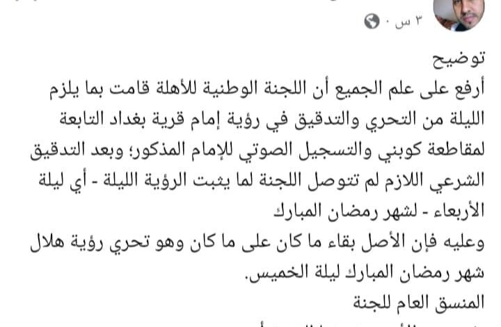 وأوضح المنسق، في تدوينة نشرها على حسابه بموقع فيسبوك، أن اللجنة تلقت معطيات تفيد برؤية الهلال من طرف إمام قرية بغداد التابعة لمقاطعة كوبني، وباشرت على إثرها إجراءات التحري والتدقيق.