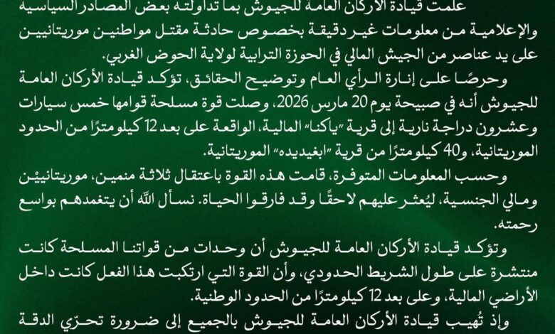 الجيش الموريتاني: حادثة مقتل منمين وقعت داخل الأراضي المالية وقواتنا تؤمّن الحدود